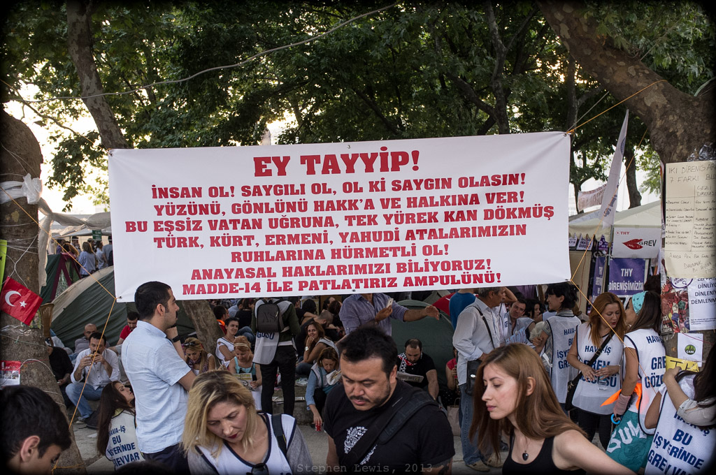 Banner heading: ‘”Addicted to Pepper Gas/Gezi.” Gezi Park Occupation, Istanbul, early-June 2013. (Fuji X100) (For larger image, click on photo.)