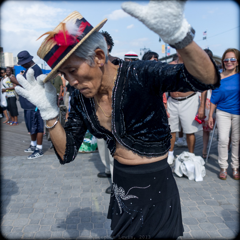 For the last couple of decades, impromptu dances set to the blare of portable sound systems and music decks manned by proprietors and patrons of boardwalk bars attract a crowd of dancers representative of New Yorkers to whom Coney Island is the only affordable and accessible seaside respite from the thick air, stuffy apartments, and burning pavements of summer time New York. (This despite the efforts of former mayor Giuliani to expunge such offenses against “quality of life” and of soon-to-be-former mayor Bloomberg to sanitize, gentrify, and recycle neighborhoods and public space for the benefit of those with high incomes and volumes of disposal cash.)