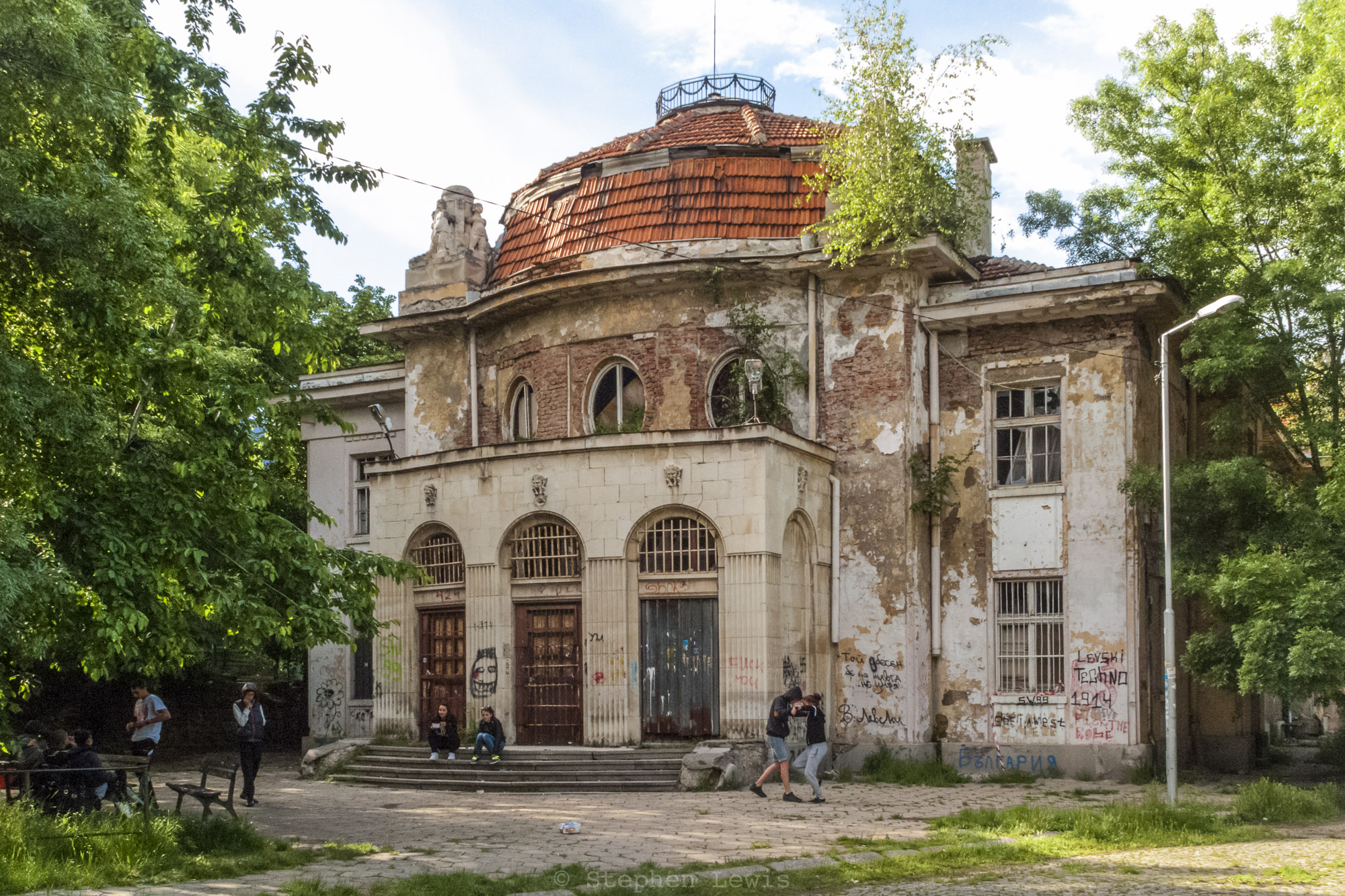 The ornate former entranceway to the abandoned bathing pavilion at Gorna Banya, a one-time spa resort just outside of Sofia.  Today, Gorna Banya is a quiet residential village but in the first decades of the 20th-century, it was sufficiently popular as a resort and suburban residential locale to merit being the terminus of one of Sofia’s first electric trolley-bus routes.  In the early years of the last century, Gorna Banya had the added panache of being the site of Bulgaria’s military cavalry school and later, less romantically, of an armored tank battalion.