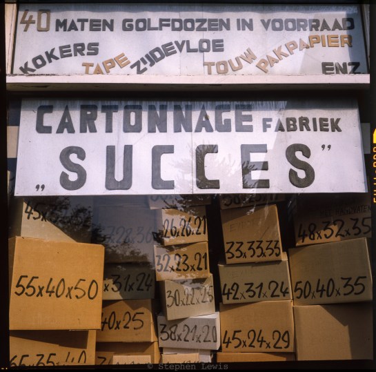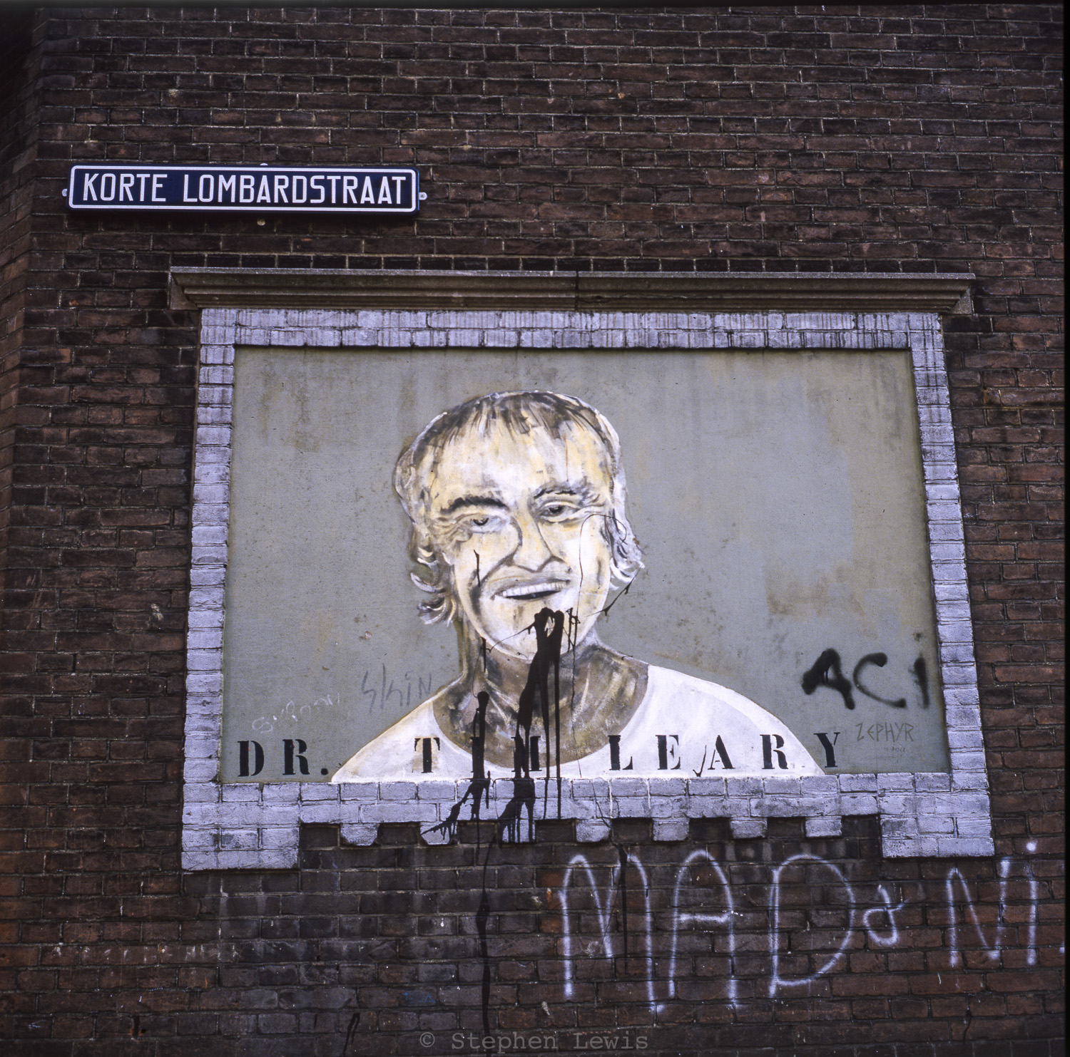 In the 1970s and 1980s, the old downtown core of The Hague was in limbo. 17th- and 18th-century townhouses were neglected and underutilized, providing low-cost space for marginal and low-overhead businesses that had not yet fled to more modern, automobile-friendly quarters in newer high-rise neighborhoods and industrial terrains; fledgling restaurants geared to the cuisine and tastes of new immigrants, Turkish and Chinese mostly; “red-light”-related enterprises; drug “culture;” and dwellings up for squatting. Still, the characteristic tone of the The Hague prevailed. In the photo above: a stark window display embodied The Hague’s no-nonsense approach to commerce, its contents stacked precariously and its sans-serif letter-press signage true to the spareness of the city’s aesthetics. In the photo below: the wryness of the city’s understated sense of humor comes to the fore in a cartoonish, delightfully innocent-looking, street mural portrait of — of all people — American LSD guru Dr. Timothy Leary, with random defacement and senseless graffiti further augmenting its whimsicality.