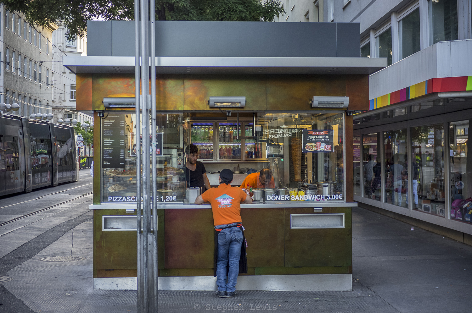 Tiger’s Box, portrayed in the third photo, with its wonderful slogan, Tierisch Gut! (“Beastly Good!”), sells takeaway noodle dishes, bland Austro-Anatolian re-imaginings of Asian mainstays. Note the black-lettered text on the left side of Tiger’s Box, partly obscured by the stand’s half-lowered louvered protective gate. The full text, a vestige of the days when the very same stand sold döner kebab (nb. Middle Eastern shoarma, Greek gyros) reads: “Kebap Essen, Probleme Vergessen,” in English: “Eat kebab, forget your problems” — a straight-forward spiritual prescription of sufficient wisdom and simplicity to warrant adoption as a mantra.