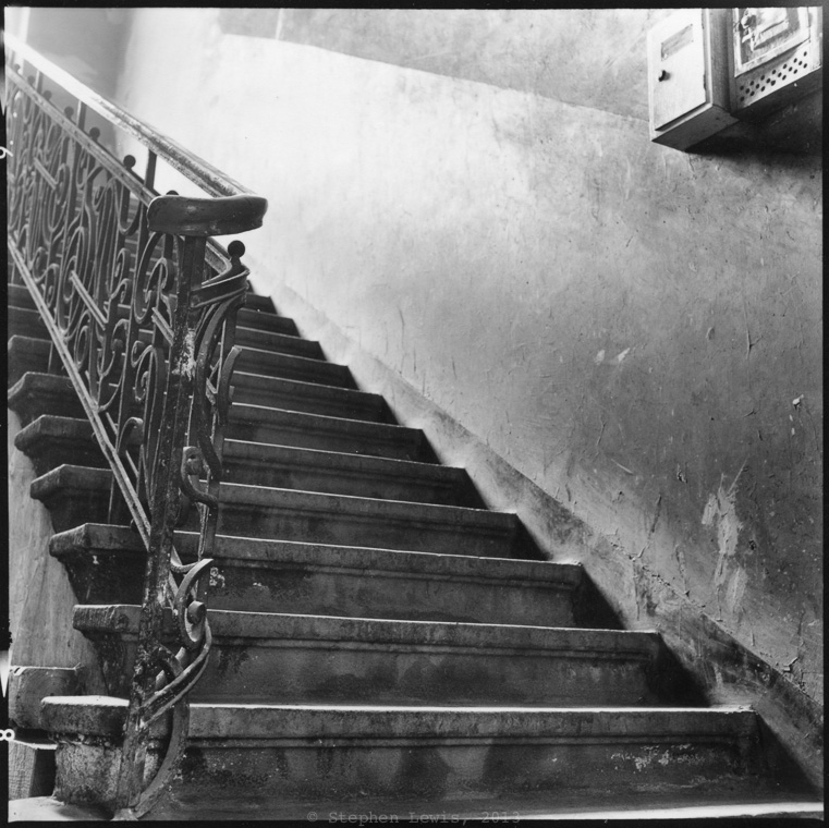 Stairway, vicinity of the Women’s Market (aka Georgi Kirkov Pazar), the outdoor market of Sofia, Bulgaria, 1998. (Rolleiflex Tessar f3.5, Ilford HP5.) Click on image to enlarge